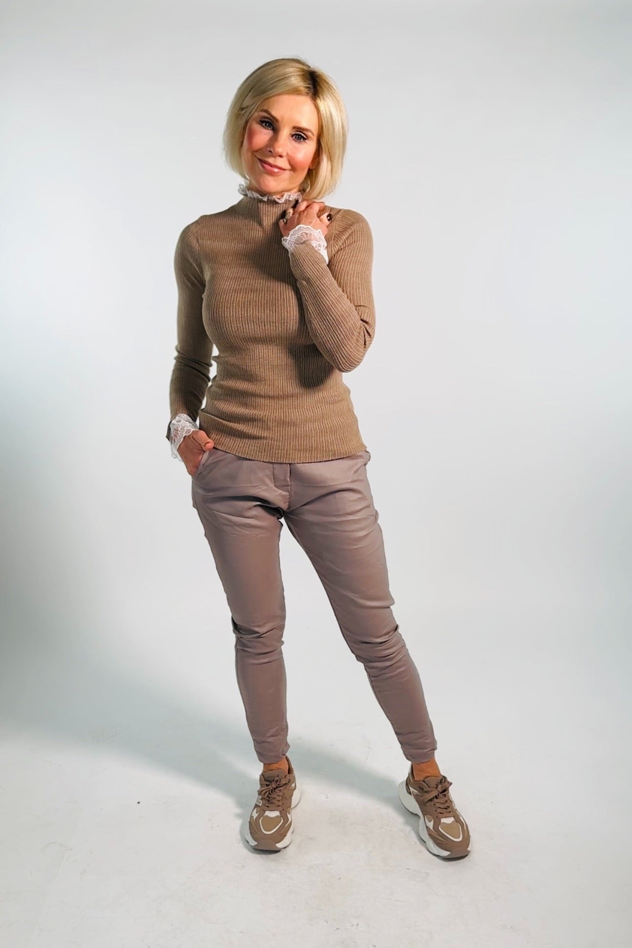 - Kanten detail bij hals en onderkant mouwen