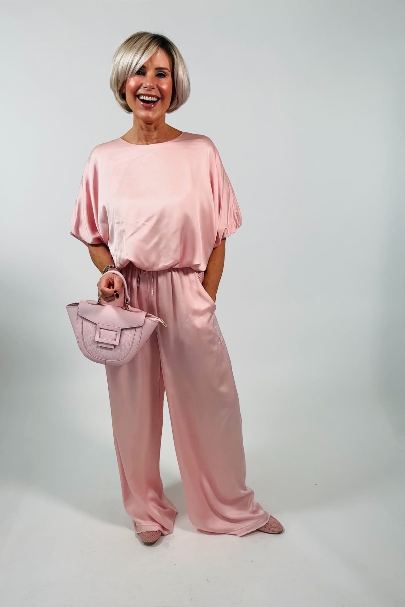 Afmetingen: pantalon taille (in stretch) ca. 44 cm binnenbeenlengte ca. 78 cm blouse oksel-oksel ca 65 cm lengte ca. 44 cm