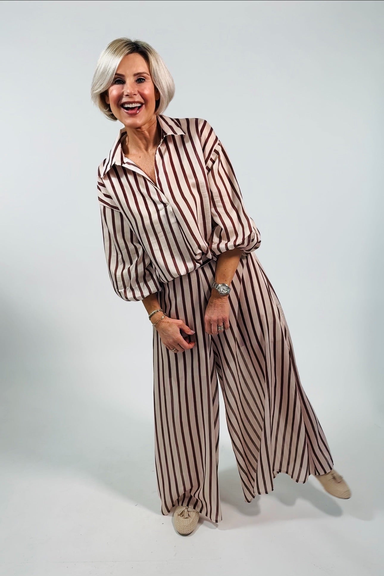 Afmetingen: pantalon taille (in stretch) ca. 40 cm binnenbeenlengte ca. 65 cm blouse oksel-oksel ca 60 cm lengte ca. 69 cm