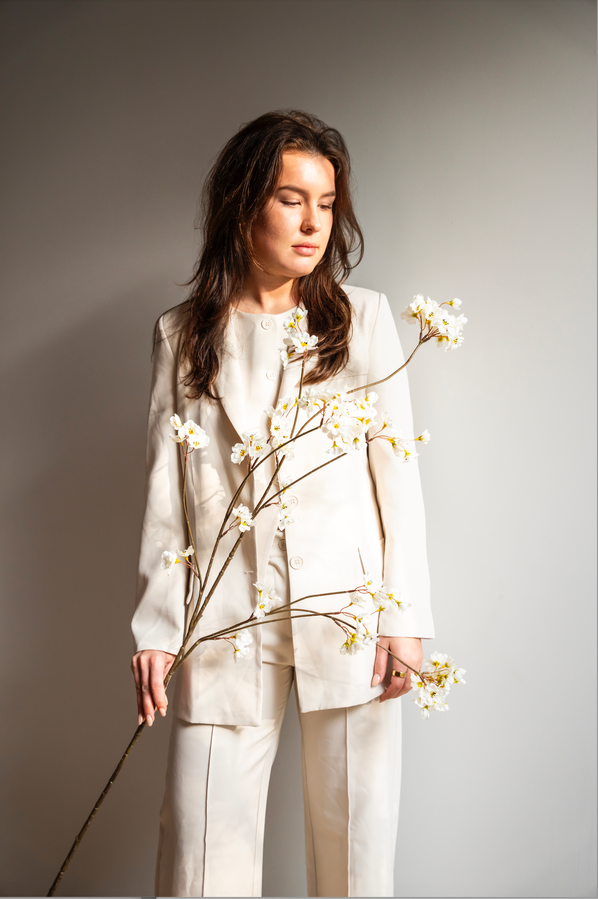 • 3x Elegante kunstbloesemtak in crèmekleur, ideaal voor stijlvolle decoratie.